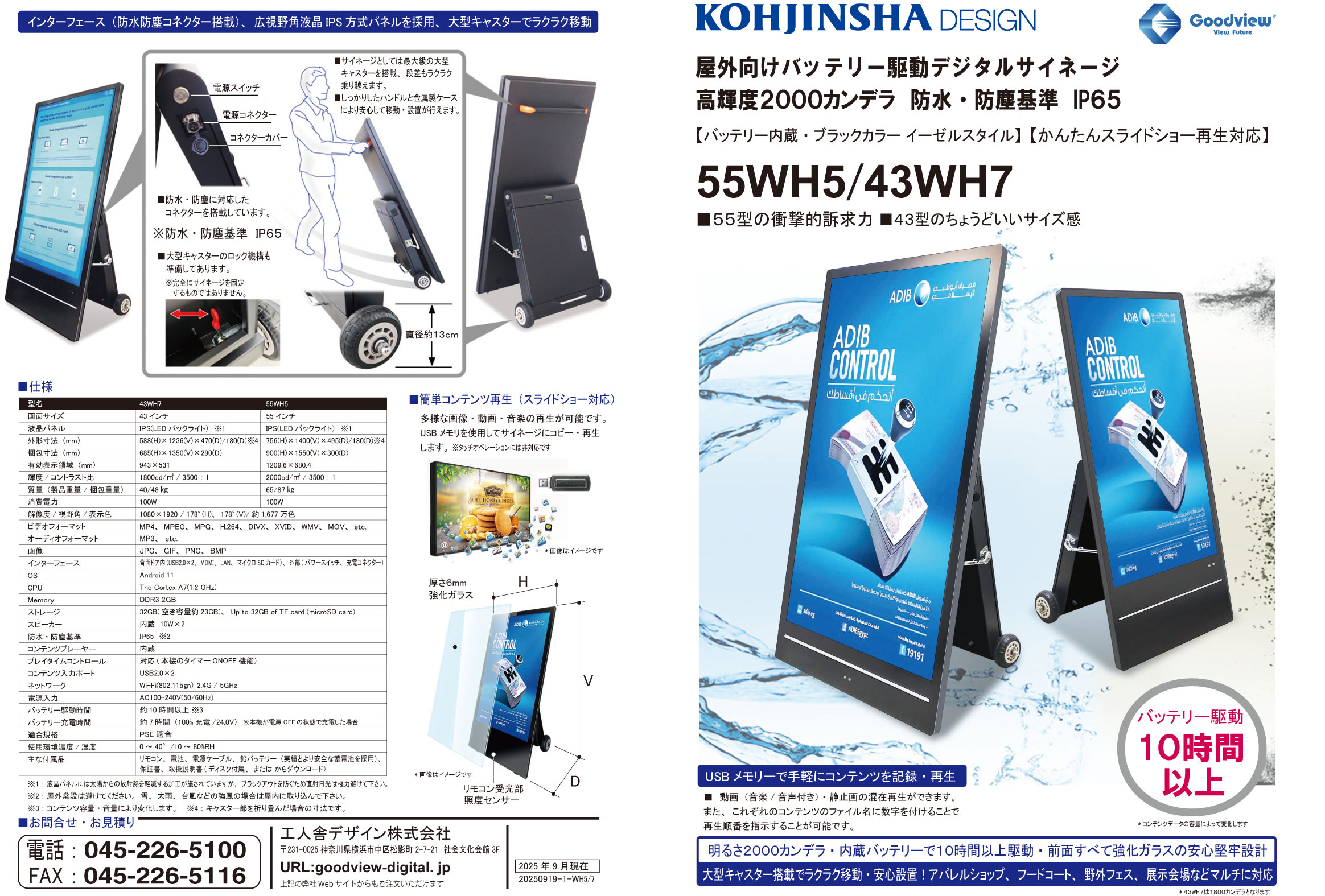 グッドビュー デジタルサイネージのカタログダウンロード 55WH5/43WH7 屋外向けバッテリー駆動デジタルサイネージ 高輝度2000カンデラ 防水・防塵基準 IP65 > DOWNLOAD 43WH3 屋外向けバッテリー駆動デジタルサイネージ 高輝度1500カンデラ 防水・防塵基準 IP65 > DOWNLOAD 55FUH, 43FUH 高輝度700カンデラ4K 液晶パネルデジタルサイネージ > DOWNLOAD 43WH1 高輝度700カンデラの屋外向けバッテリー駆動モデル 防水・防塵IP65 バッテリー連続駆動20時間 > DOWNLOAD TCSシリーズ 人気のタッチ対応コンテンツ作成ソフト付きモデルが静電容量方式・狭額縁・薄型軽量化 > DOWNLOAD TC3Sシリーズ タッチ対応コンテンツ作成ソフト付き・静電容量方式・薄型軽量サイネージと高さ調整スタンドのセットモデル > DOWNLOAD TC5Sシリーズ タッチ対応コンテンツ作成ソフト付き・静電容量方式・薄型軽量サイネージとイーゼルスタンドのセットモデル > DOWNLOAD TC7Sシリーズ タッチコンテンツ作成ソフト付きモデルとディスプレイ角度調整スタンドのセット 静電容量方式 狭額縁 薄型軽量化 > DOWNLOAD SAHシリーズ オールインワンサイネージが高輝度700カンデラLCDパネル搭載・狭額縁・超薄型軽量化 > DOWNLOAD SH3シリーズ 高輝度700カンデラ・狭額縁・超薄型軽量化デジタルサイネージと高さ調整スタンドのセットモデル > DOWNLOAD SH5シリーズ 高輝度700カンデラ・狭額縁・超薄型軽量化デジタルサイネージとイーゼルスタンドのセットモデル > DOWNLOAD SH7シリーズ 高輝度700カンデラ・狭額縁・超薄型軽量化デジタルサイネージとディスプレイ角度調整スタンドのセットモデル > DOWNLOAD 55LHCS 自立型タッチパネル電子看板 タッチコンテンツ作成ソフト付きがホワイトカラーで登場 静電容量方式・超薄型軽量化 > DOWNLOAD L10シリーズ 人気の自立型オールインワンサイネージが狭額縁・薄型軽量化で登場 > DOWNLOAD DH1シリーズ 両面ディスプレイサイネージ 天吊りモデル (室外側面は明るさ800カンデラ、室内側面は450カンデラ) > DOWNLOAD ビデオウォール PDシリーズ ビデオウォール PDシリーズ > DOWNLOAD